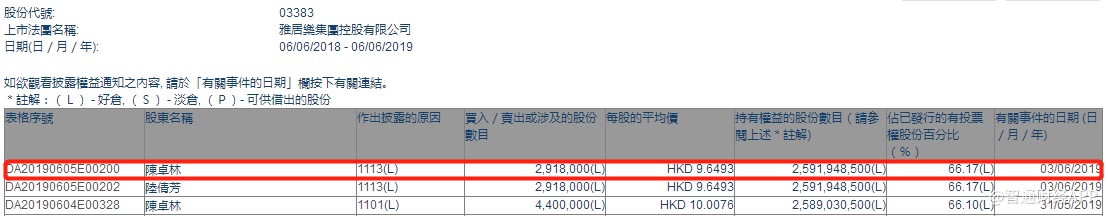 智通财经APP获悉,根据联交所资料显示,陈卓林于6月3日增持雅居乐集团(03383)291万股,每股作价9.65港元,总值约2808.15万港元,最新持股数目约25.91亿股,最新持股比例为66.17%。