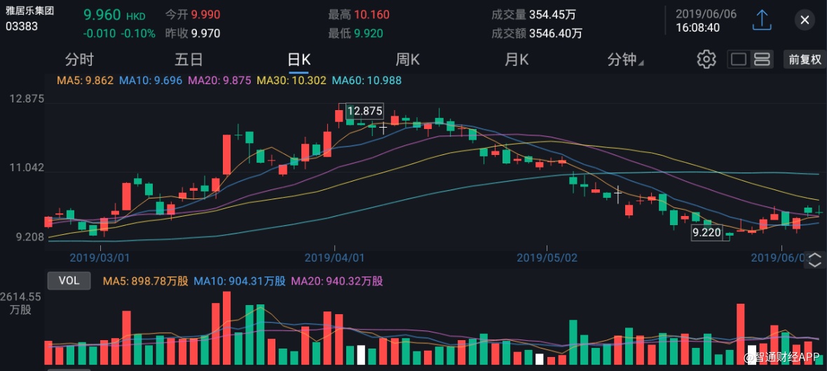 截至今日收盘,雅居乐集团(03383)跌0.10%,报9.96港元。