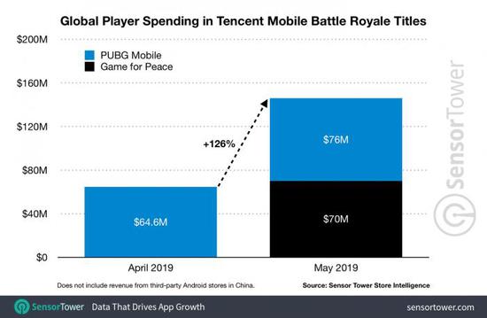 智通财经APP获悉,6月6日,第三方调查机构SensorTower指出,腾讯(00700)出品的吃鸡手游《绝地求生》与《和平精英》,在2019年5月收入为1.46亿美元(不包括中国安卓手机市场的收入),约合人民币10亿元,比去年同期的570万美元增长约24.6倍。其中,《和平精英》占总收入的48%(约7000万美元),海外运营的《绝地求生》占7600万美元。值得注意的是,两款游戏较其四月份6500万美元的收入上涨近126%。