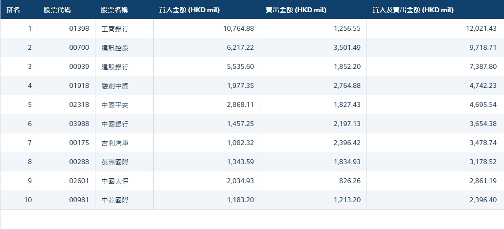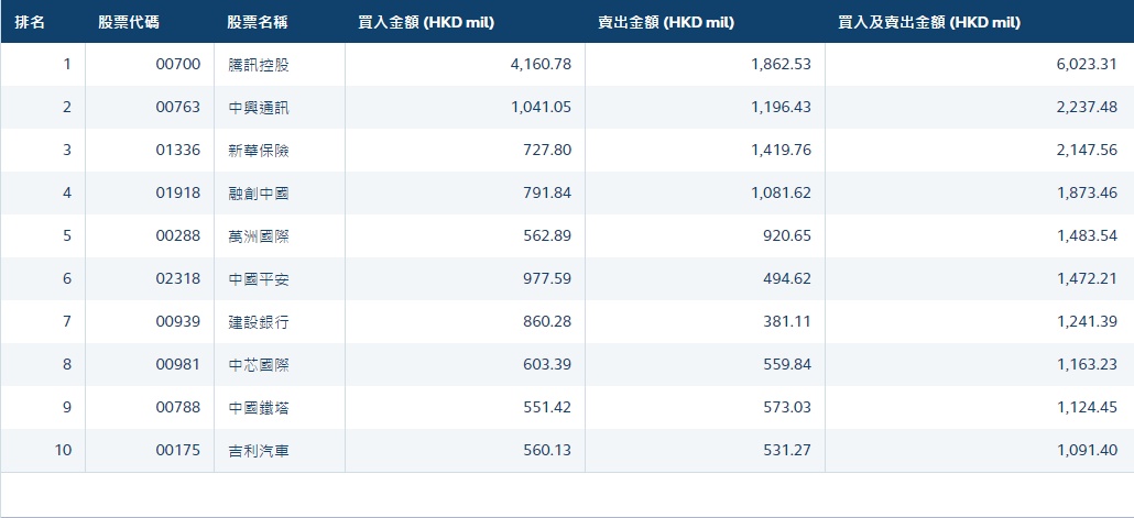 成交活跃股方面,港股通(沪)南下资金前三大成交股分别为工商银行(01398)、腾讯控股(00700)及建设银行(00939);港股通(深)南下资金前三大成交股分别为腾讯控股、中兴通讯(00763)及新华保险(01336)。