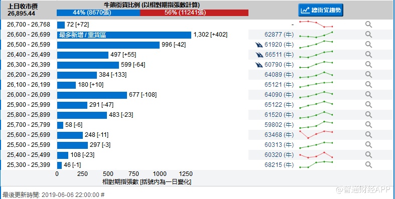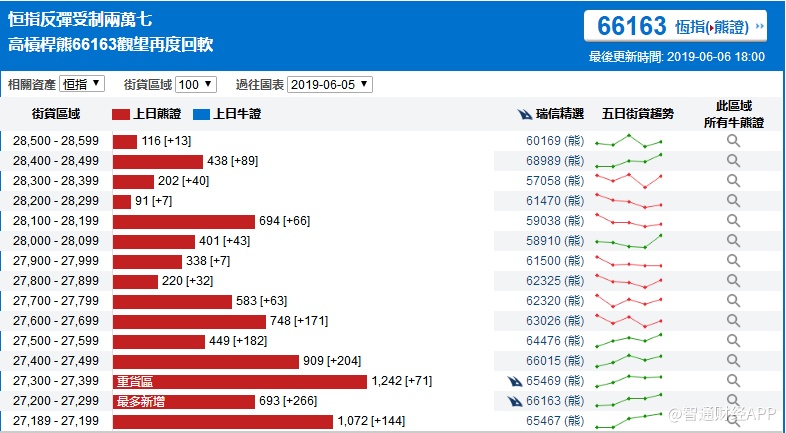 智通财经APP获悉,截至6月6日,恒指最新的牛熊街货比例44:56。瑞信恒指牛熊证街货分布图中的数据显示,熊证街货重货区在27300-27399间,该区间最新熊证数量为1242张,较上一交易日增加71张;最多新增区间在27200-27299间。牛证街货重货区在26600-26699区间,该区间最新牛证数量为1302张,比上一交易日增加402张;最多新增区间在同一区间。
