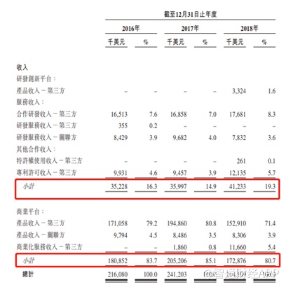 不过智通财经APP观察到, 2016年至2018年,和黄中国收入分别为2.16、2.41及2.14亿美元(单位下同),而研发创新平台收入占比分别为16.3%、14.9%及19.3%,商业平台则占比达到83.7%、85.1%及80.7%,从收入结构看和黄中国可能称为成药销售企业更加合适。