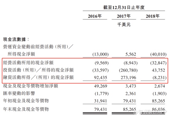 由于经营活动并未盈利,经营活动所得现金流净额常年为负,现金所得主要依靠融资。2016年和2017年分别融资9244万美元及2.73亿美元,而这两笔融资主要源于2016年在美国上市,通过预托证券的形式融得。