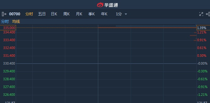 智通财经APP获悉,腾讯(00700)再有两款游戏获批版号,此消息刺激股价快速上扬,截至9时20分,涨1.39%,报价335港元,成交额4.479亿。