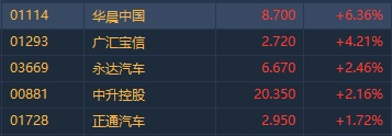 智通财经APP获悉,汽车经销商板块上周四尾盘冲高后,今日再度发力,早盘悉数上扬,截至发稿,华晨中国(01114)涨6.36%,广汇宝信(01293)涨4.21%,永达汽车(03669)、中升控股(00881)涨超2%。