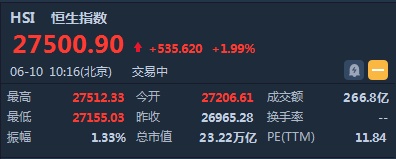 智通财经APP获悉,恒生指数早盘飙升逾500点,蓝筹股全线上涨。截至10时16分,恒指涨535.62点或1.99%,报价27500.9,成交额暂为266.8亿。