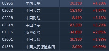 智通财经APP获悉,高盛指内险股估值吸引,吁“买入”中国平安(02318)及中国财险(02328)。内险股全线走高,截至10时38分,中国太平(00966)涨4.3%,报价20.15港元,国寿(02628)涨3.97%,中国财险涨3.18%,中国平安涨2.29%。