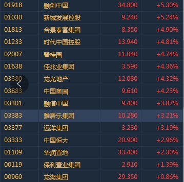 智通财经APP获悉,内房股全线大涨,截至11时24分,融创中国(01918)涨5.3%,报价34.8港元,新城发展(01030)涨5.24%,碧桂园(02007)涨4.74%,佳兆业集团(01638)涨4.36%,中国奥园(03883)涨4.23%,融信中国(03301)涨3.87%,中国恒大(03333)涨2.96%。