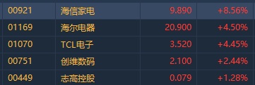 智通财经APP获悉,家电板块早盘表现强势,涨幅居前,截至发稿,海信家电(00921)涨8.56%,海尔电器(01169)涨4.5%,TCL电子(01070)涨4.45%,创维数码(00751)涨2.44%。