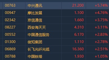 智通财经APP获悉,上周四5G概念股获利盘出逃,板块承压,个股悉数收跌,今日早盘重获资金追捧,截至发稿,中兴通讯(00763)涨5.74%,摩比发展(00947)涨4.76%,京信通信(02342)涨3.75%,俊知集团(01300)涨2.78%。