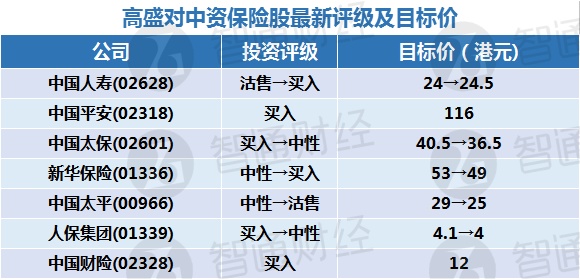 以下是高盛对中资保险股最新评级及目标价: