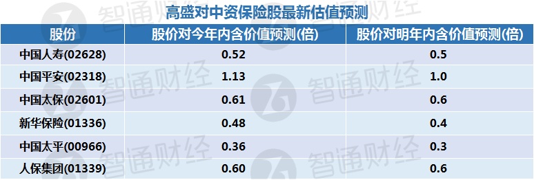 高盛还列出了对中资保险股最新估值预测: