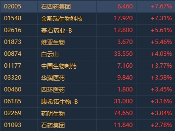 智通财经APP获悉,上周连续多日阴跌的医药板块今日迎反弹,显著回暖,截至发稿,石四药(02005)涨7.67%,金斯瑞(01548)涨7.31%,基石药业-B(02616)、维亚生物(01873)涨超5%、中生制药(01177)涨3.77%,石药(01093)、药明生物(02269)涨近3%。