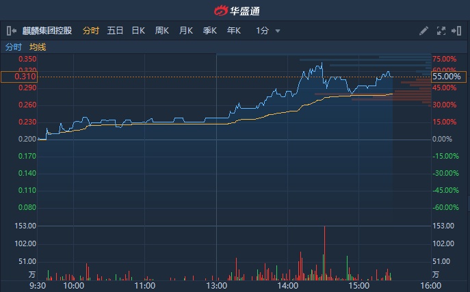 智通财经APP获悉,麒麟集团(08109)午后发力上攻,涨幅不断扩大,一度逾67%,后收窄,截至15时31分,涨55%,报0.31港元,成交额达651.9万港元。