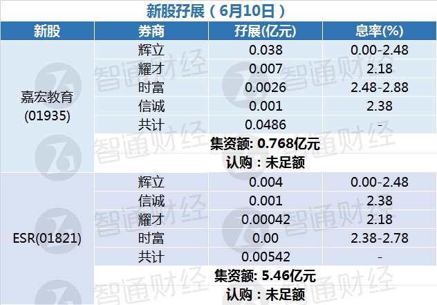 智通财经APP获悉,嘉宏教育(01935)、ESR(01821)正在招股中。截至6月10日,辉立、耀才、时富、信诚分别为其借出0.768亿港元和0.00542亿港元,嘉宏教育和ESR孖展均未足额。