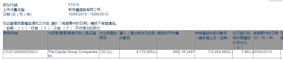智通财经APP获悉,根据联交所资料显示,The Capital Group于6月6日减持新秀丽(01910)417万股,每股作价16.2487港元,总值6790.76万港元,最新持股数减至1.12亿股,最新持股比例减至7.86%。