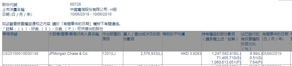 智通财经APP获悉,根据联交所资料显示,摩根大通于6月5日减持中国电信(00728)257万股,每股作价3.9283港元,总值1012.29万港元,最新持股数减至12.47亿股,最新持股比例减至8.99%。