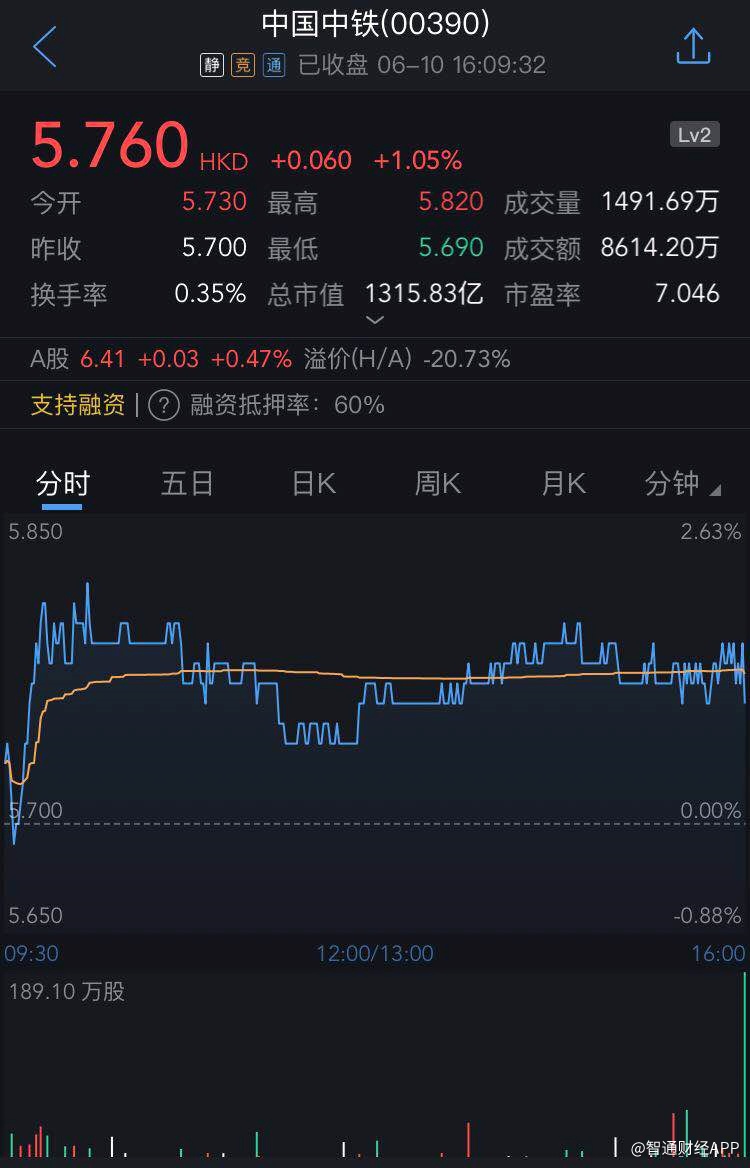 截至今日收盘,中国中铁(00390)涨1.05%,报5.76港元。