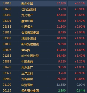 智通财经APP获悉,内房板块再度走强,融创中国(01918)领涨板块。截至13时53分,融创中国涨6.15%,报价37.1港元,佳兆业集团(01638)涨3.91%,龙光地产(03380)涨3.66%,融信中国(03301)涨3.47%,中国恒大(03333)涨2.9%,碧桂园(02007)涨1.64%。