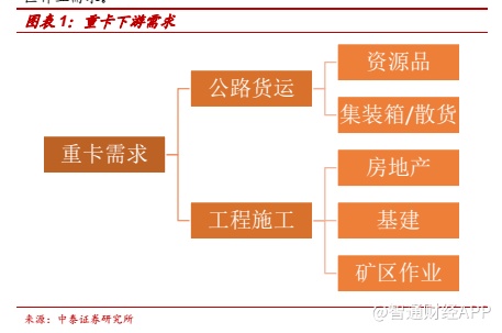 重卡的下游需求来看主要分为公路货运和工程类需求两类。重卡公路货运需求的增长一方面来源于公路周转量的提升,另一方面来源于对中卡轻卡等其他运输方式的替代。工程类重卡主要来源于房地产、基建、矿区作业需求。