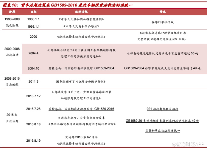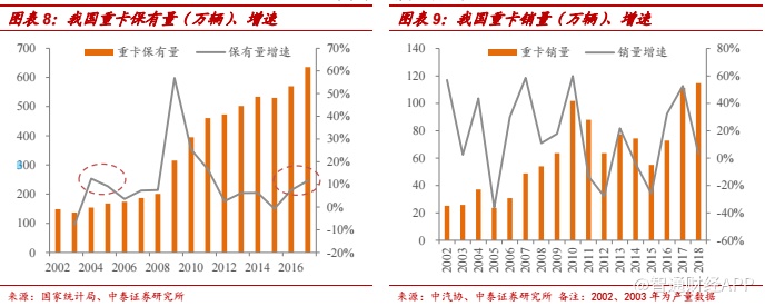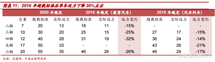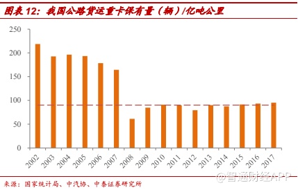 单车运力下降,保有量提升。(1)2004 年发布了 GB1589-2004 代替了GB1589-1989,同时启动了超载治理,单车运力下降带来了保有量的增长。(2)GB1589-2016 更改车辆限重后,交警和路政执法标准统一。根据我们的测算,新 GB1589 超载认定标准后重卡单车平均运力下降 20%左右,将带来保有量的提升。