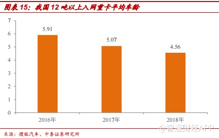 车龄持续下降,短期行业自然更新需求有限。GB1589-2016 以及治超以来,2016 年到 2018 年全网 12 吨以上重卡平均车龄大幅下降。考虑到未来三年内环保因素将主导重卡的更新需求,重卡车龄将持续下降,短期内行业自然更新需求有限。