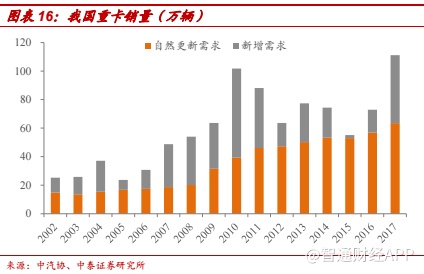 保有量提升,销量中枢上移。2016 年重卡保有量为 563 万辆,单车运力下降 20%,理论上行业保有量扩容至 710 万辆左右。2017 年重卡保有量达到了 637 万辆,治超带来保有量提升的效应逐渐释放,保有量预计将会进一步提升。以十年的自然使用寿命计算,每年的自然更新需求就有 71 万辆。