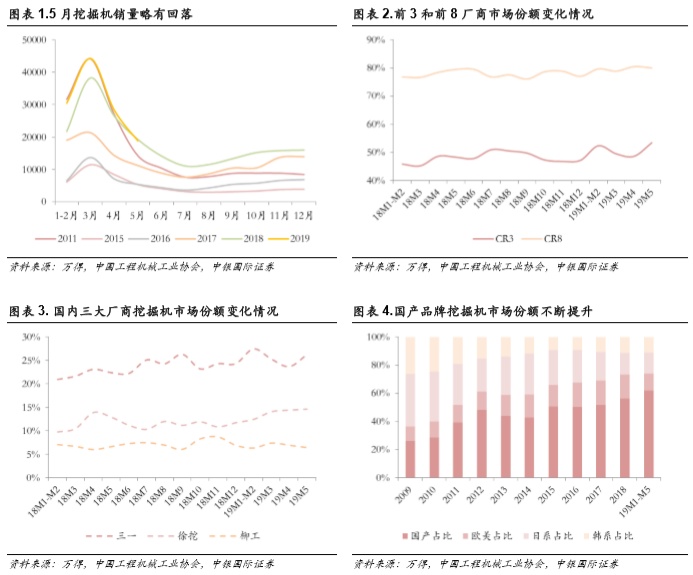 1)5月挖机销量虽小幅下滑,但对19年不悲观,预计全年将实现5%-10%的增长,销量持续大幅下滑的概率较低;