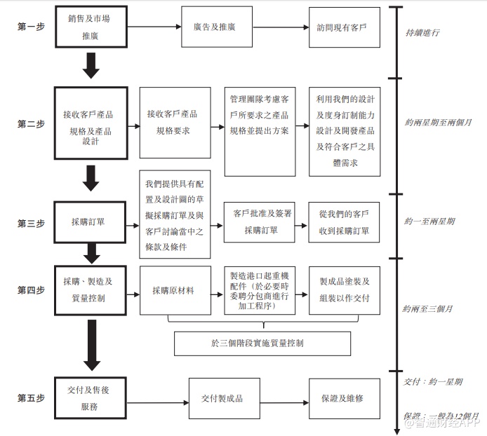 集团业务模式可分为五个阶段,主要包括:1)销售及市场推广;2)接受客户产品规格及产品设计;3)采购订单;4)采购、制造及质量控制;5)交付及售后服务。下图为集团业务模式概述: