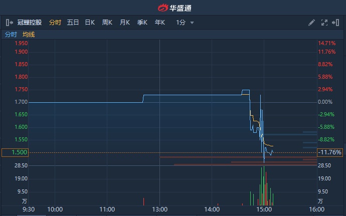 智通财经APP获悉,午后开盘小幅上扬的冠轈控股(01872)临近尾盘快速跳水翻绿,截至15时9分,跌11.76%,报1.5港元,成交额达333万港元。