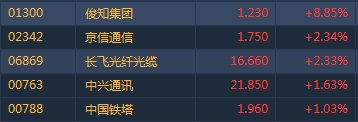 智通财经APP获悉,5G概念随A股集体走高,俊知集团(01300)领涨板块。截至15时43分,俊知集团涨8.85%,报价1.23港元,京信通信(02342)涨2.34%,中兴通讯(00763)涨1.63%,中国铁塔(00788)涨1.03%。