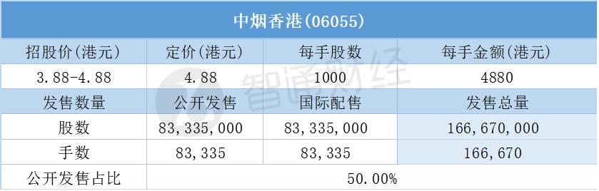 智通财经APP获悉,6月11日,中烟香港(06055)配售结束。配售招股价区间为3.88-4.88港元,最终定价4.88港元,每手4880港元。