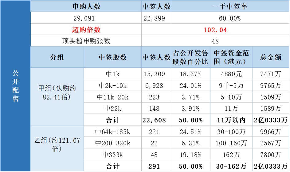 其中,公开配售申购人数29091,一手中签率60%,超购倍数约102.04倍。