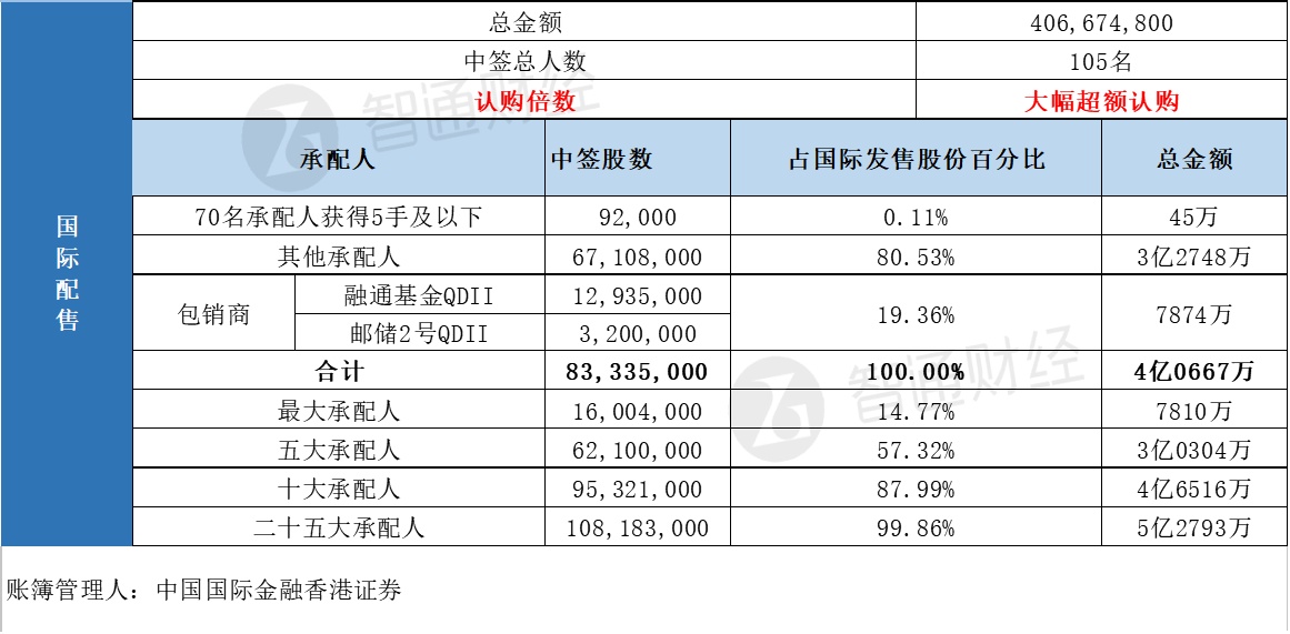 国际配售中签总人数共105名,认购倍数为大幅超额认购。