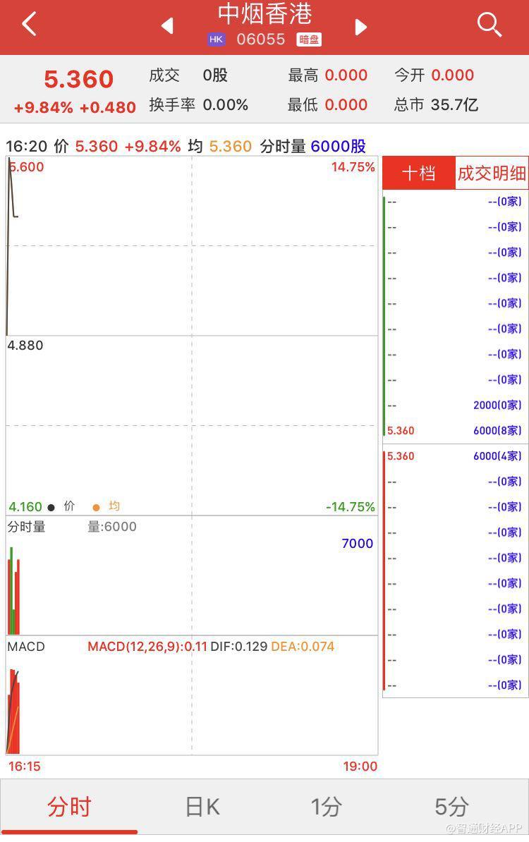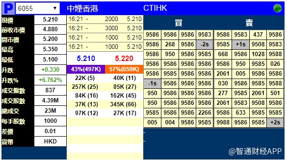 智通财经APP获悉,中烟香港(06055)将于6月12日挂牌,上市前夕,截止到发稿,其暗盘报5.21港元,较招股价4.88港元,涨6.762%,成交额3910万元。每手1000股,不计手续费,每手赚330港元。