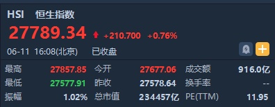 截至收盘,恒生指数涨210.7点或0.76%,报27789.34点,全日成交额达916.02亿。国企指数涨0.89%,报10620.13点,红筹指数涨0.23%,报4364.03点。