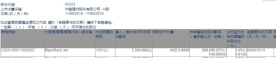智通财经APP获悉,根据联交所资料显示,贝莱德于6月6日减持中国建材(03323)335万股,每股作价5.8866港元,总值1974.36万港元,最新持股数减至2.68亿股,最新持股比例减至6.95%。
