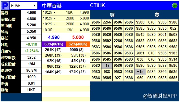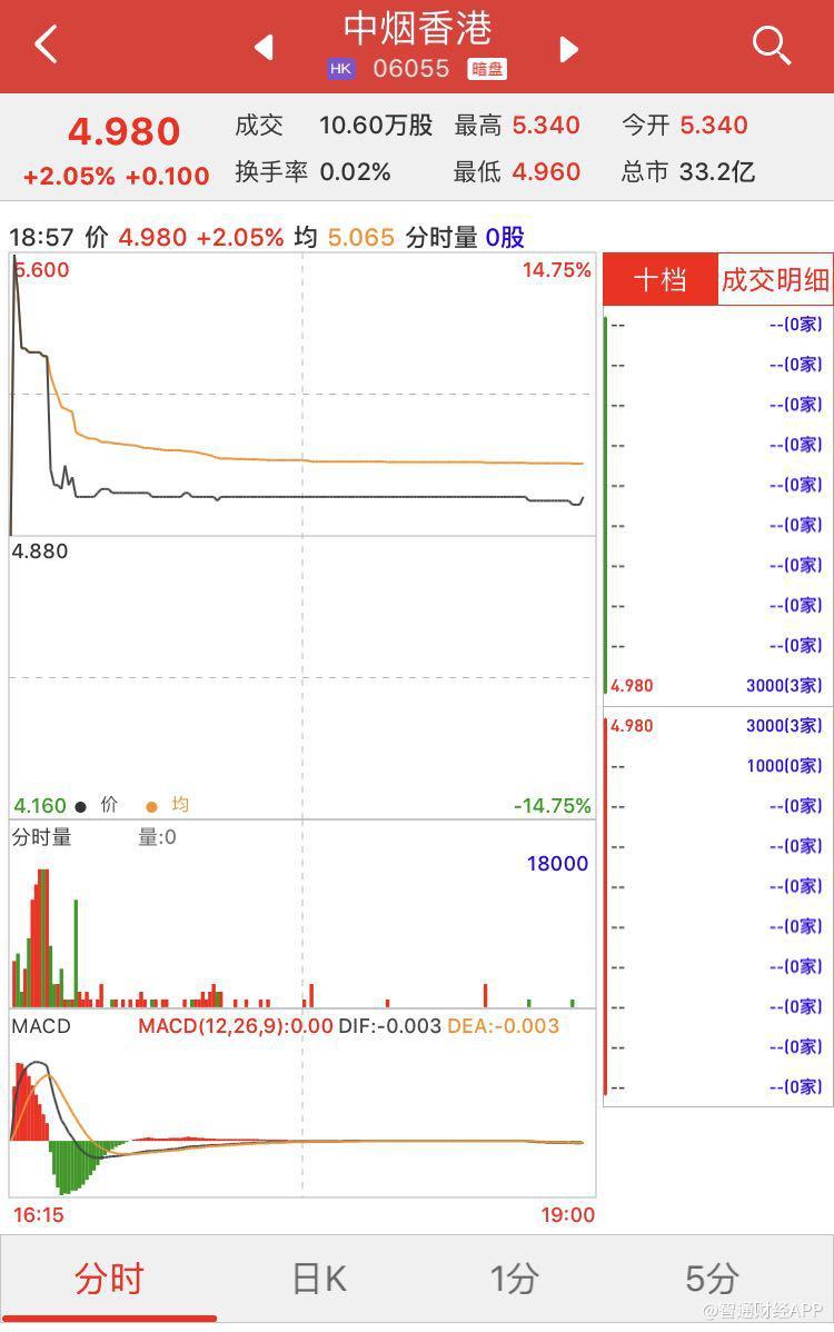 智通财经APP获悉,中烟香港(06055)将于6月12日挂牌,上市前夕,其暗盘收报4.99港元,较招股价4.88港元,涨2.254%。每手1000股,不计手续费,每手赚110港元。