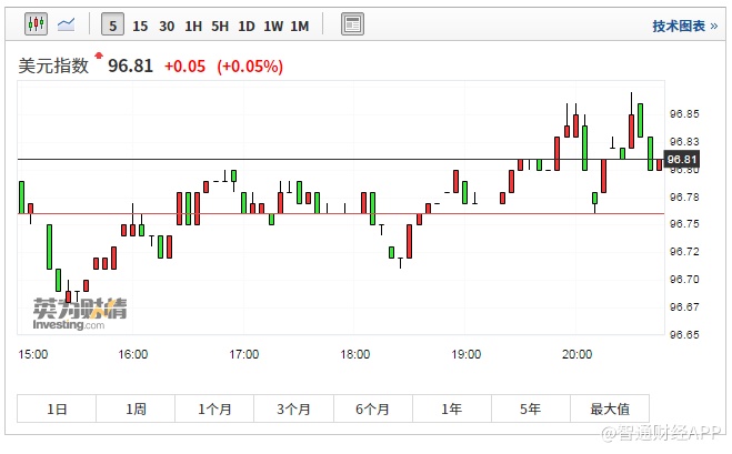 该数据公布后,美元指数反应平淡,截至发稿时间报96.81,涨幅0.05%。