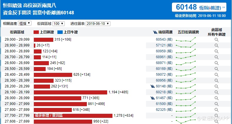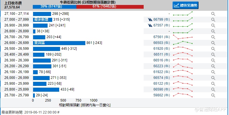 智通财经APP获悉,截至6月11日,恒指最新的牛熊街货比例39:61。瑞信恒指牛熊证街货分布图中的数据显示,熊证街货重货区在27700-27799间,该区间最新熊证数量为1278张,较上一交易日增加634张;最多新增区间也在该区间。牛证街货重货区在26600-26699区间,该区间最新牛证数量为861张,比上一交易日减少243张;最多新增区间在27000-27099区间。