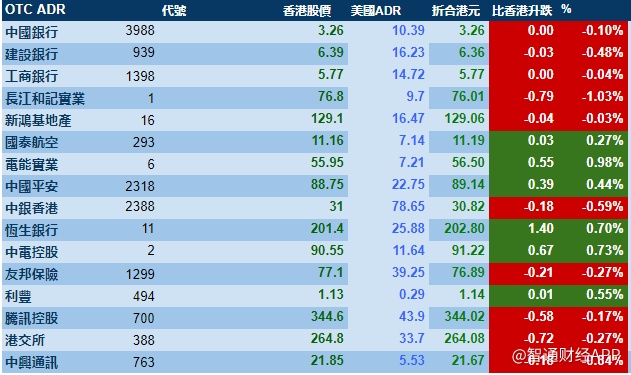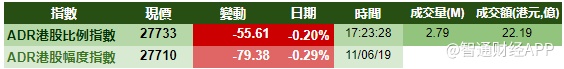 智通财经APP获悉,港股ADR指数全日偏软,按比例计算,收报27733点,跌55.61点。大型蓝筹微挫,汇丰控股收报65.43元,较港收市跌0.02元;腾讯控股收报344.02元,较港收市跌0.58元。