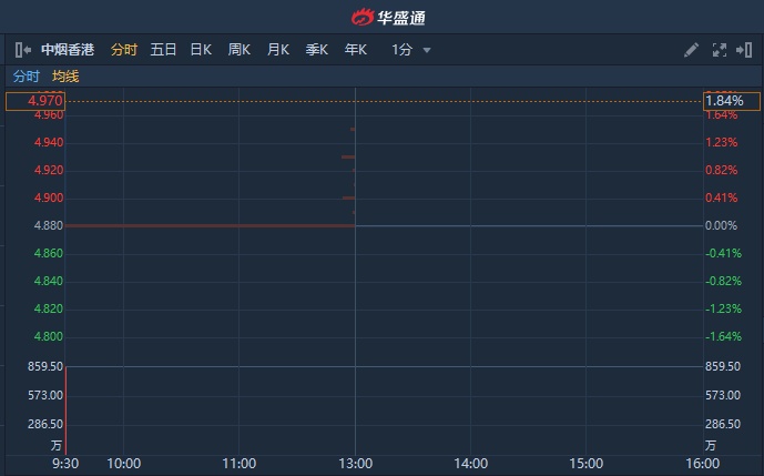 智通财经APP获悉,中烟香港(06055)首日挂牌,截至9时20分,涨1.84%%,报价4.97港元港元,成交额1.43亿港元。