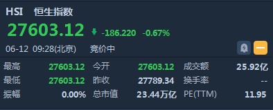 智通财经APP获悉,恒生指数开盘跌186.22点或0.67%,报27603.12点。国企指数跌0.52%,报10564.61点。红筹指数跌0.1%,报4359.73点。大市盘前成交25.92亿港元。隔夜美股高开低走,三大股指微幅收跌。人造肉公司Beyond