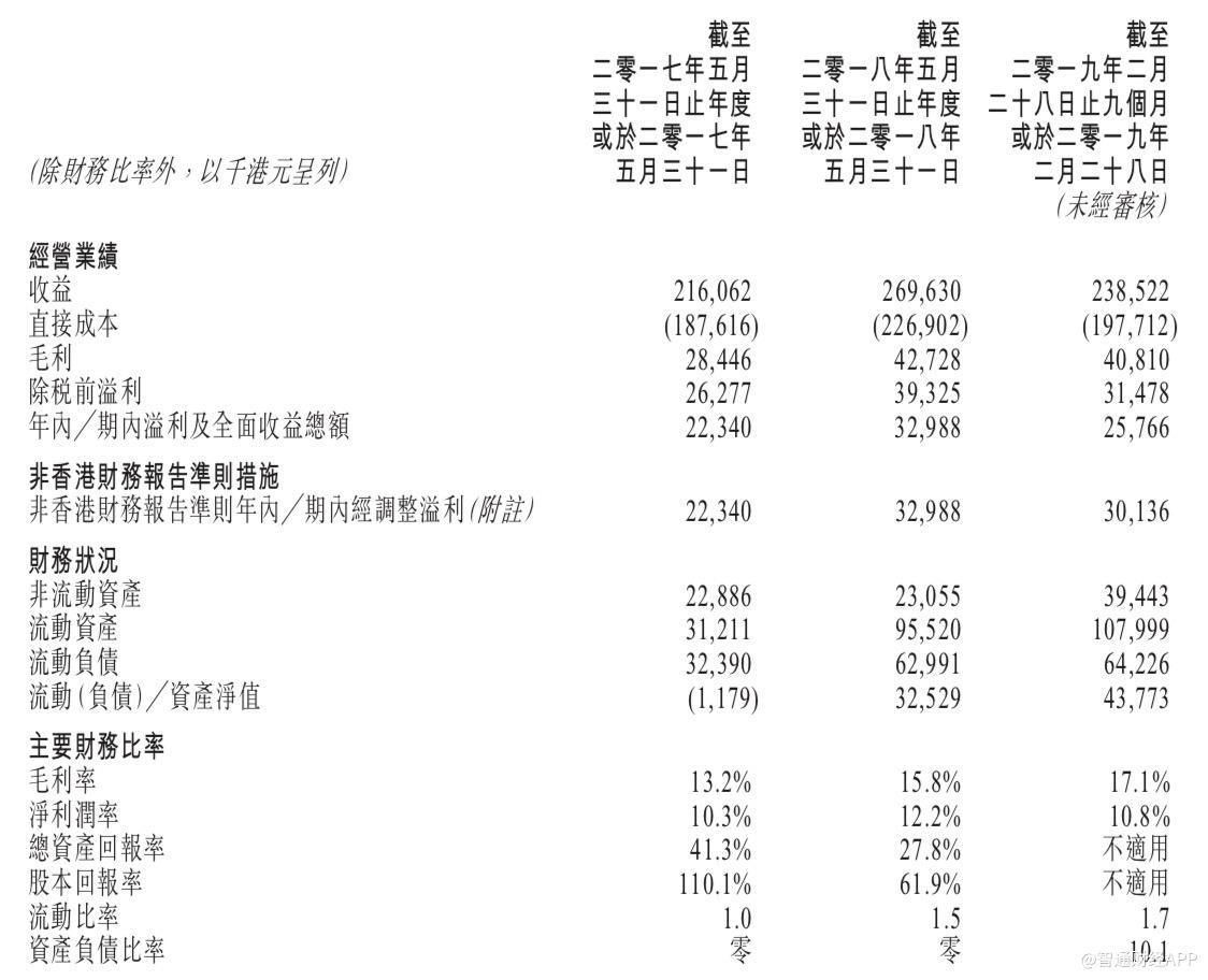 招股书显示,于2017年5月31日,该集团录得流动负债净额约 1.2 百万港元。随后,2017年5月31日的净流动负债状况于2018年5月31日转为净流动资产状况。于2017年5月31日,录得流动资产净额约 32.5 百万港元。 于2019年2月28日,录得流动资产净额约 43.8 万港元,由流动资产约108.0 百万港元及流动负债约 64.2 百万港元组成。