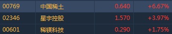 智通财经APP获悉,稀土概念随A股集体大涨。截至10时12分,中国稀土(00769)涨6.67%,报价0.64港元,星宇控股(02346)涨3.97%,稀镁科技(00601)涨1.75%。