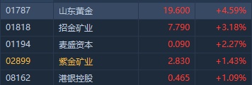 智通财经APP获悉,黄金板块逆势受追捧,截至发稿,山东黄金(01787)涨4.59%,招金矿业(01818)涨3.18%,紫金矿业(02899)涨1.43%。