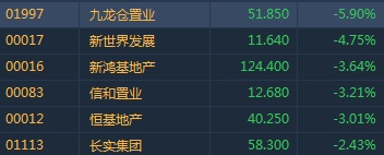 智通财经APP获悉,香港地产股全线走弱,截至14时46分,九龙仓置业(01997)跌5.9%,报51.85港元,新世界发展(00017)跌4.75%,新鸿基(00016)跌3.64%,恒基地产(00012)跌3.01%,长实集团(01113)跌2.43%。
