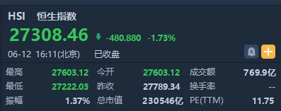 截至收盘,恒生指数跌480.88点或1.73%,报27308.46点,全日成交额达769.98亿。国企指数跌1.18%,报10494.78点,红筹指数跌1.27%,报4308.6点。