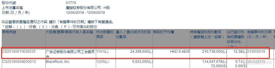智通财经APP获悉,根据联交所资料显示,广发证券股份有限公司工会委员会于5月31日增持广发证券(01776)2440万股,每股作价9.4836港元,总值约2.31亿港元,最新持股数目2.11亿股,最新持股比例为12.38%。
