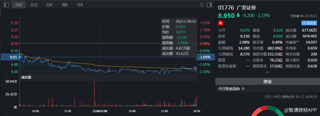 截至今日收盘,广发证券(01776)跌2.19%,报8.95港元。
